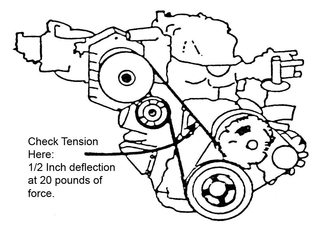 26. Install the supercharger drive belt and adjust the tension with the idler pulley adjustment. Visually line up the idler pulley with the belt before tightening the clamp bolt. Make sure there is clearance between the front of the idler arm and the back of the supercharger pulley. The belt is tensioned properly when a 20 lb. force applied mid-span on the tension strand results in a ½ inch deflection, Figure 5.