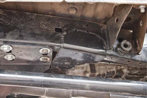 10. Slide the upper link bracket in place between the front cab body mount and the skid plate on the passenger side. Some grinding may be required to fit the bracket in place.