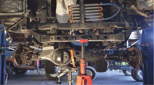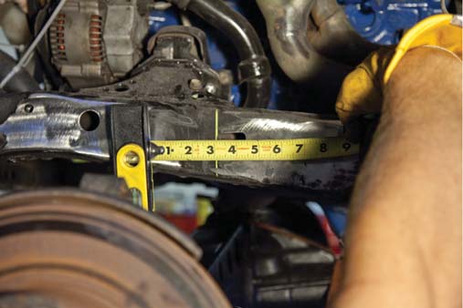 2. Mark the center line of the front axle on each side of the frame. These marks will provide a reference when all brackets are cut off. Determine how far forward you want to move your axle. There are many considerations for this, including desired wheelbase, tire clearance, steering cylinder clearance, and the type of frame.
