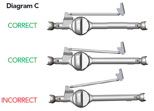 23. Panhard link must be level at ride height or at a negative angle for proper handling of the vehicle as shown below in Diagram C.