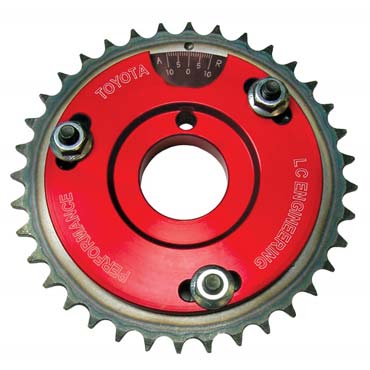 Adjustable Cam Gears are the only way to change cam timing on 20R, 22R, 2RZ and 3RZ series Toyota motors and still be accurate. Adjustable cam gears are generally used to correct camshaft timing after the cylinder head has been milled or when the block is decked. Cam gears are an effective way to dial-in a camshaft by advancing the cam for low-end power or retarding the cam for top-end power. Adjustable cam gears can be used with mechanical fuel pumps by machining the concentric fuel pump drive to clear the three separate 10mm bolts on the adjustable cam gear. This is made easier by reversing the bolts in the cam gear.