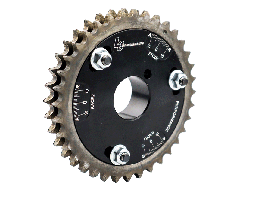You will notice on your new adjustable cam gear that there are 3 separate sets of degree marks. There is a "STOCK", a "RACE 1" and a "RACE 2" (see pic). The "STOCK" degree marks are based on a stock, non-adjustable cam gear. Because of the numerous variations in engines; including head decking, block decking, camshaft size etc... there is no way to know exactly where your specific engines cam timing true "0" is at. LC Engineering always recommends that you degree your camshaft in with the new gear so that you can find the true "0" on your engines. If this is not an option for you then LC Engineering has come up with an alternate method that will work but is not nearly as accurate. Read through both the "Basic" and "Advanced" installation guidelines below to determine which method you will use.