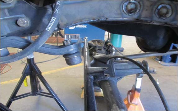 13. Continued - Once all links and panhard have been installed, raise the vehicle/ lower the axle to maximum droop. The upper link will touch the bottom of the upper link bracket and or the u joint will start to bind. This will be full extention when shocks are installed. Using the shock strips as a guide, fabricate suitable shock mounts(we used a 15" hoop as an example). With the long shock strips installed (full droop) ensure that the drag link will drop bellow the steering arm and is not bound up.