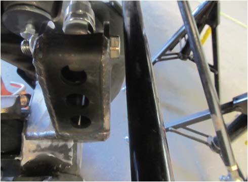 12. Tack the bungs into the panhard tube and install rod ends. Bolt the panhard to the axle side bracket. Bolt the frame side bracket to the other end of the panhard. Now swing forward and aft until the panhard bar is parallel with the tierod, and is at the same downward angle as the drag link. Once this is set , tack the bracket into place.