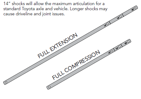 14. Once you have set full droop, compress the axle and install the short shock strips. Ensure the panhard is not contacting the oil pan (this may not always be possible). If the panhard is contacting the oil pan you will need to limit the suspension up travel to accommodate by using bump stop's(recommended). Also , ensure that the tie rod end at the pitmen arm does not contact the tie rod tube when suspension is compressed.