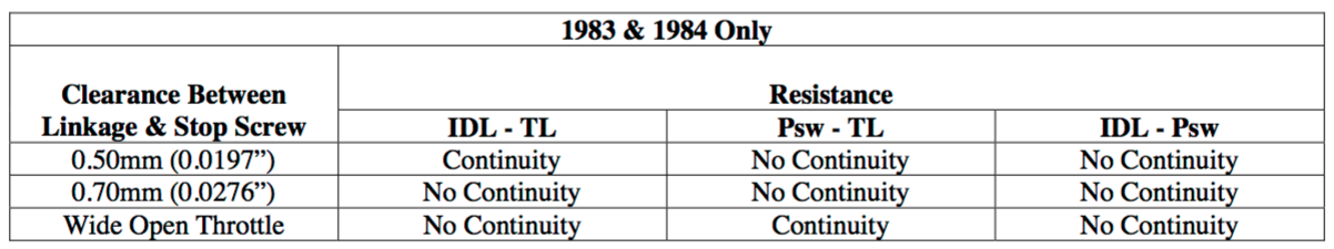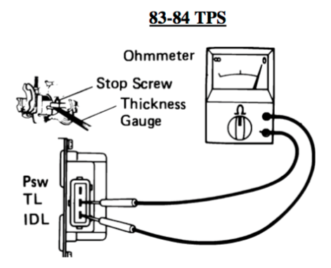 - If your TPS makes the idle transition (below 2300 to infinite) but it will do it at 0.90mm instead of at 0.85mm does this mean the TPS is bad? Probably not, if everything else checks out, you may just be seeing the effect of the manufacturing tolerances of the TPS and the throttle body stacking up and pushing the setting outside the "normal" range. But if the TPS never makes the idle transition (i.e. it reads infinite at all throttle openings) then it is bad.