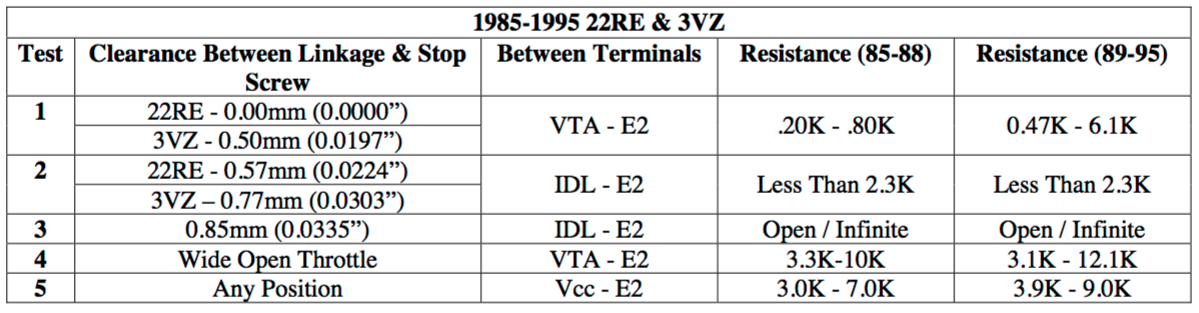 - One final test, not listed would be to run the TPS shaft from idle to wide open throttle and watch the VTA-E2 resistance and make sure it increases steadily, no drop outs or dead spots. If you observe abrupt resistance changes, the TPS could be faulty.