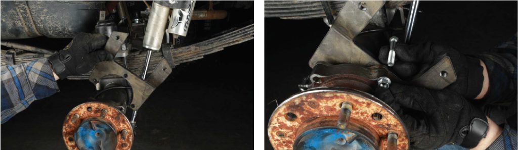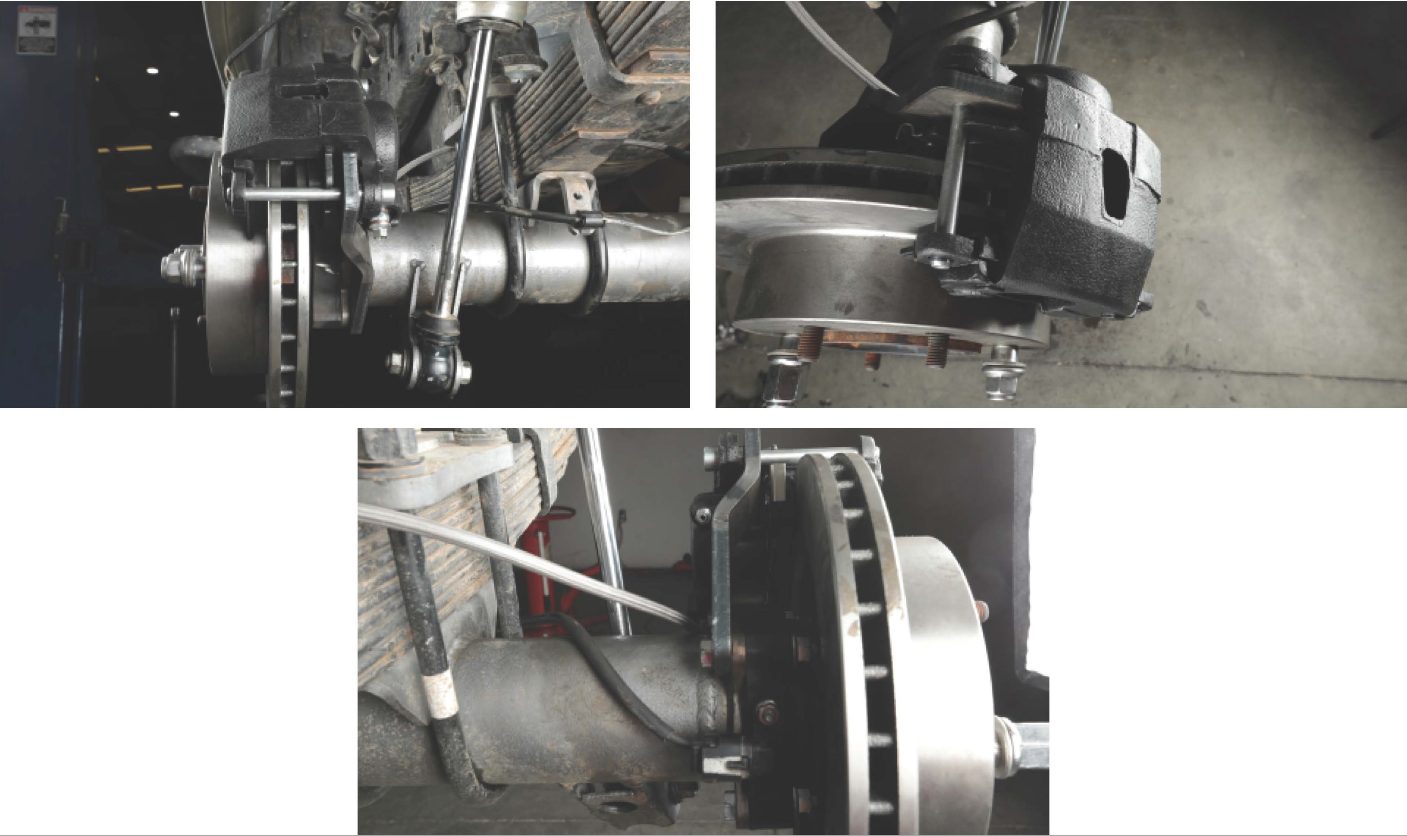 Using (3) M10X60MM bolts and (3) M10 lock nuts install the brake caliper mounting bracket on the back side of the axle flange. The bracket needs to be in the 2 o'clock position (on the driver's side), or above the axle to the rear of the vehicle. The brake line enters the caliper from the bottom and the bleeder is on the top on both sides of the vehicle.
