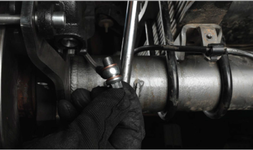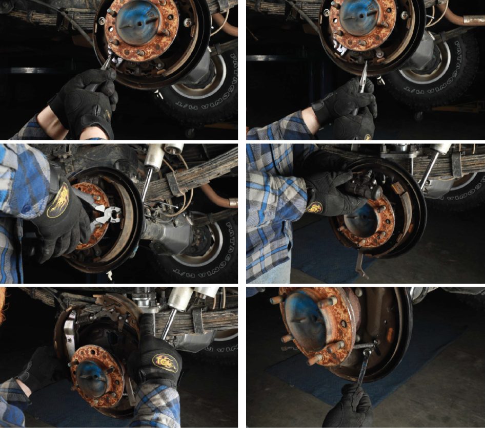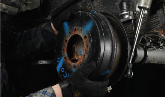 Step 1: Safely support the vehicle by the rear axle housing so the rear wheels are off the ground and free to rotate. Remove the rear wheels and brake drums from the rear axle.