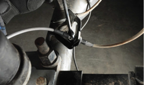 Step17: Install the other end of the brake line in the axle mounted tab closest to the caliper.