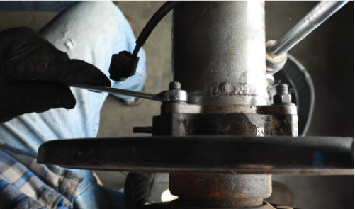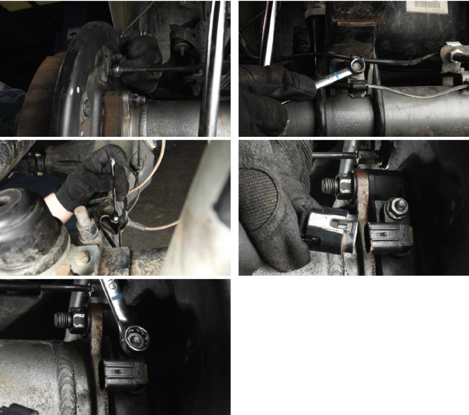 Step 2: Disconnect the brake line from the wheel cylinder and the tab mounted on the axle. Disconnect the ABS wire and remove the ABS sensor from the bearing housing.
