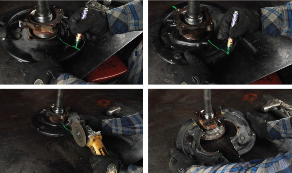 If you do not wish to re-use your brake drum backing plate use an angle grinder equipped with a cutting wheel and cut the backing plate as shown. Use care not to nick or damage the bearing housing, bearings, or axle shaft. If you are unable to cut all the way to the center of the backing plate cut as far as you can then bend the backing plate back and forth to break the remaining material.