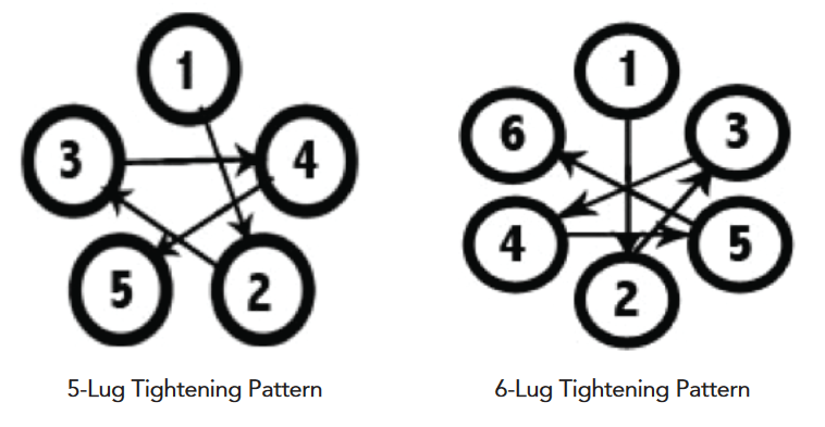 - Using a torque wrench, torque the lug nuts to 100 ft-lbs in the appropriate star pattern as shown above.
