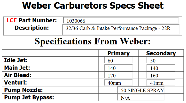 - Weber 32/36 Carburetor Only 20R/22R Electric Choke, see Part #: 1030031