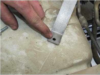 6. Align the steel Support Bracket with the mounting hole in the Air Intake Bracket and against the flat spot on the inner fender panel. Mark the location and drill a 9/32" diameter mounting hole at the marked location on the inner fender panel. NOTE: In some instances, the support bracket may need to be slightly bent to align with the fender panel correctly.