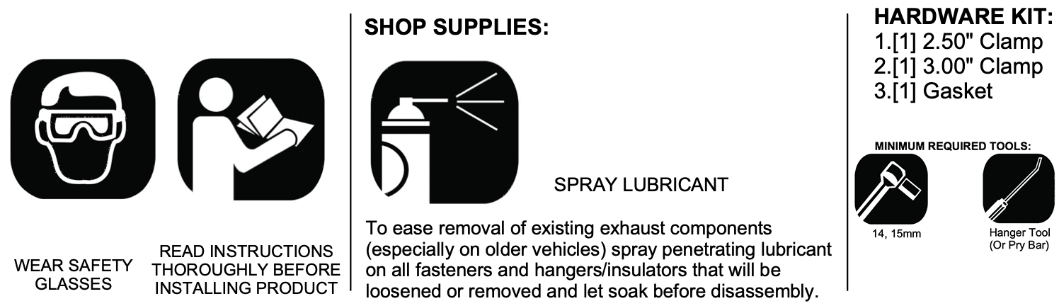 Step 4: Next use the supplied 2.50" clamp to attach the Muffler Assembly to the Inlet Pipe. Finish by attaching the Tailpipe Assembly to the Muffler Assembly with the Supplied 3.00" clamp and fitting the hangers into the insulators.