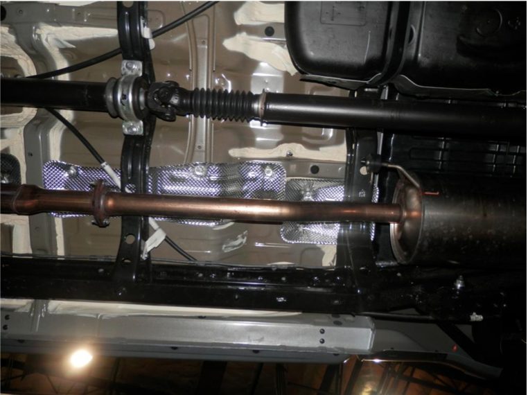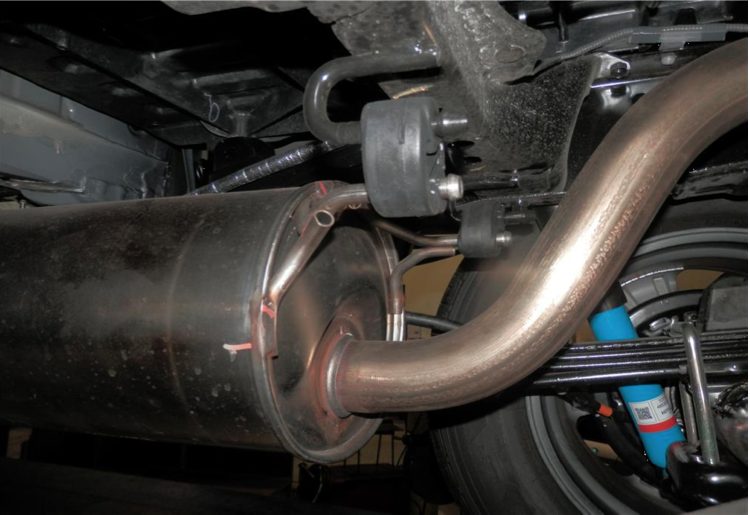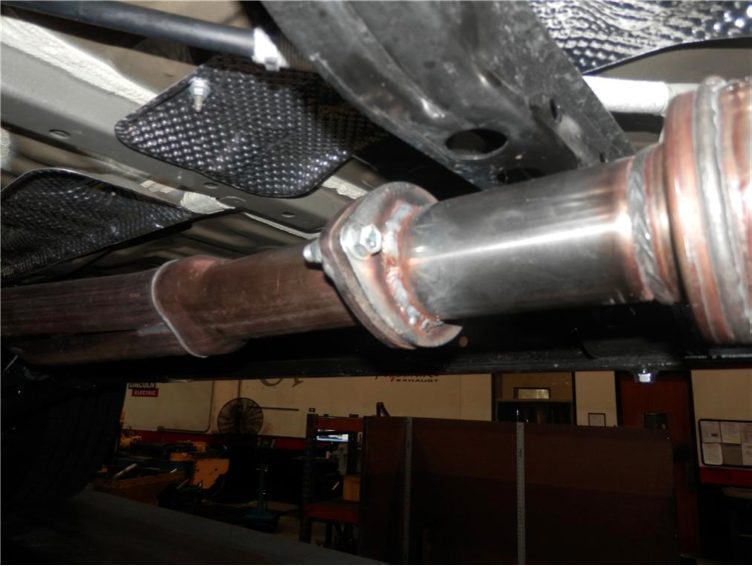 Step 1: Begin removal of the OEM exhaust system by unbolting the two bolts attaching the exhaust to the catalytic converter. Do not discard or damage the OEM fasteners or rubber insulators as they will be used to install the new system.