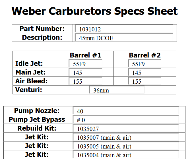 Now this company has taken it a step further (as of the Summer of 2011) and is now supplying the 32/36 DGV series and the 38 DGS series carburetors and branding them as Weber's just as they did with the Solex Carb's from South America. Below is a detail list of the models in question.