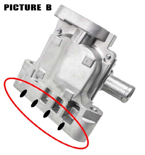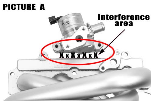 11. Reinstall the air injection system, using the brand new gasket provided with the kit. On some models the air valve may have casting that protrudes. You may need to clearance the underside edge of the valve to allow proper fitment. Reference picture A and B below.