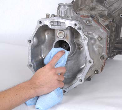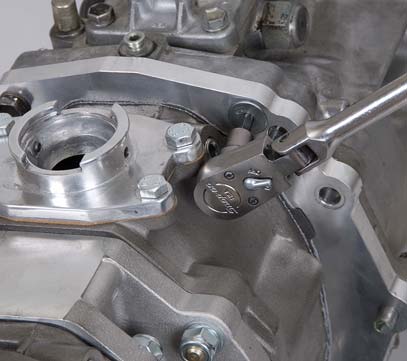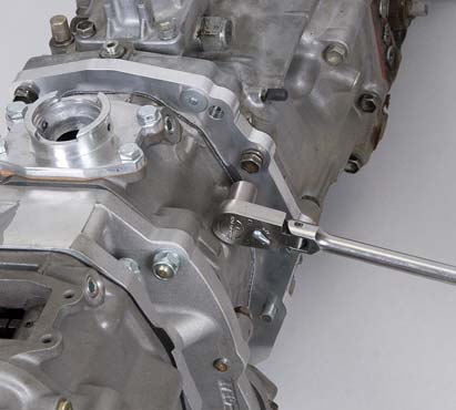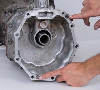 - Remove 9 bolts holding stock case to the transmission using 14 mm socket
