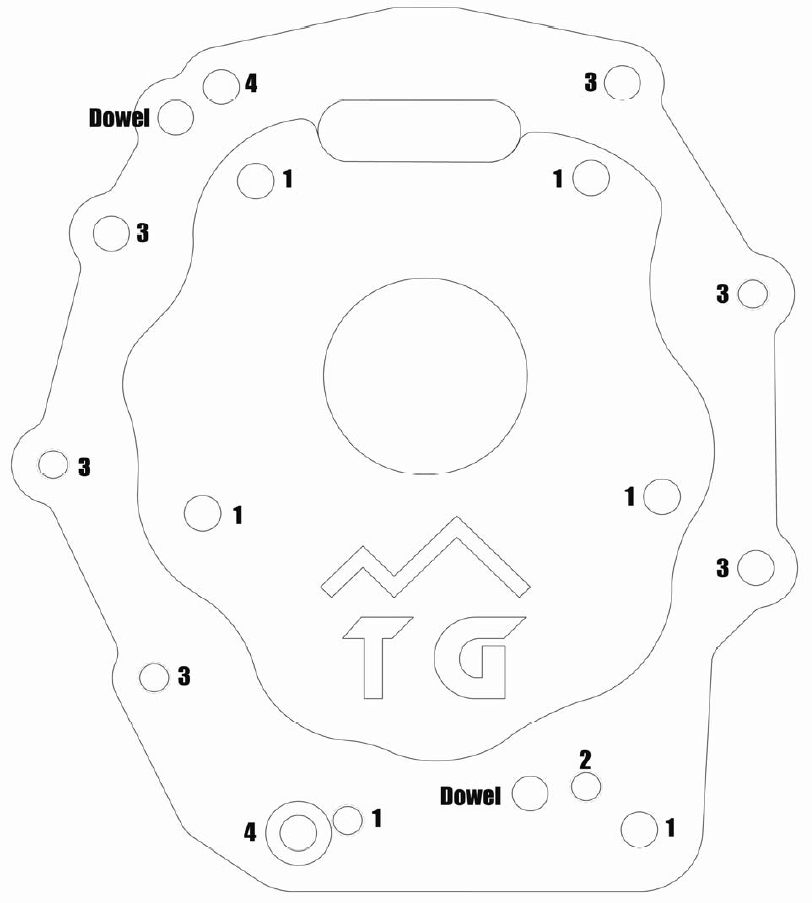 2. Install adapter plate on face of transfer case, using 4 M10-1.25x35 bolts (provided). We recommend applying blue LocTite® to threads before installation. Torque four plate bolts to 30 ft. lbs.
