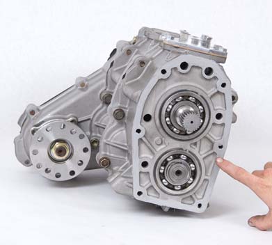 12. Using 6 of the 9 stock bolts, 1 allen head bolt and 2 M10-1.25x35 bolts, attach transfer case to transmission. Use blue LocTite® on all bolts. Tighten bolts to 30 ft. lbs.