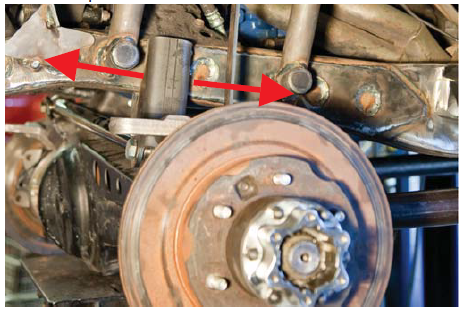12. Check the placement of the axle in the vehicle using the marks made on the frame in step 2. Axle is shown moved 3" forward of original location. Measure from frame to knuckle ball on each side to ensure that the axle is centered side to side.