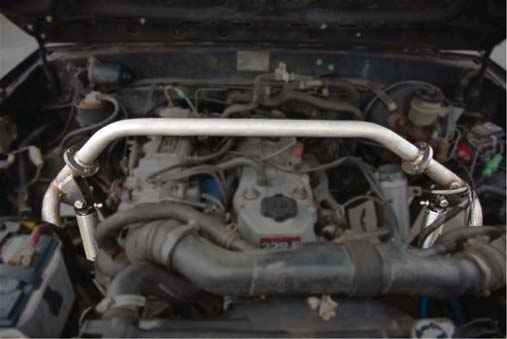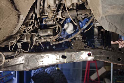 10. Slide the upper link bracket in place between the front cab body mount and the skid plate on the passenger side. Some grinding may be required to fit the bracket in place.
