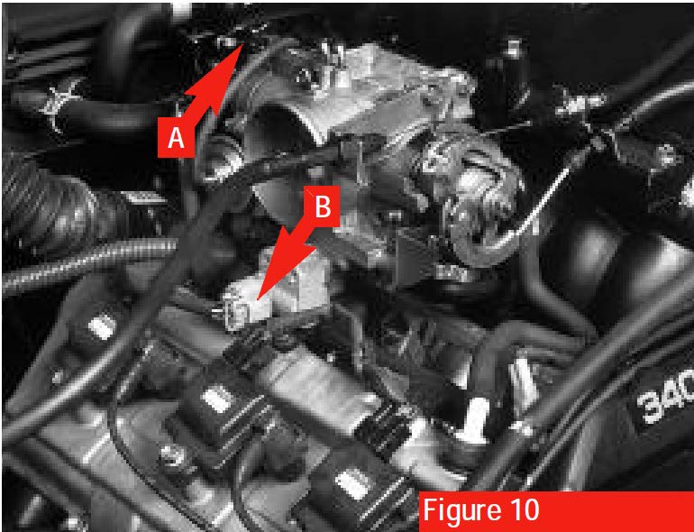 13. Unplug the throttle"position sensor connector (A) and the IAC (Idle Air Control) valve connector (B) (see arrows, figure 10).