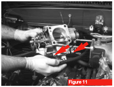 14. Remove vacuum lines from the throttle body but don't remove the two coolant hoses (figure 11). NOTE: The coolant hoses have clamps (see arrows, pictured), the vacuum hoses do not.