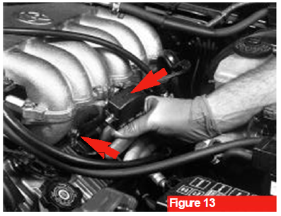 16. At the driver's side of the engine, remove the diagnostic plug from its mounting bracket (upper arrow, figure 13) and set it aside. Remove bolt and bracket that holds the diagnostic connector to the stock manifold and save for reassembly. Remove the ground wire and move it to one side (lower arrow, figure 13).