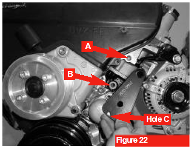 4. Using the supplied bolt (10x 1.25x 130) (figure 22), align the lower belt tensioner mounting bolt hole to Location B. NOTE: Magnuson recommends the use of a thread locking liquid (such as Loctite 262) on the 10 x 1.25 x 73mm & 10 x 1.25 x 30mm bolts in Locations A&B