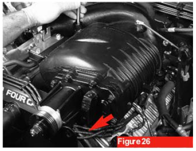 3. Lower the supercharger and manifold into place making sure there are no hoses or wires in the way. The ignition wires should be routed beneath the supercharger's drive housing (see arrow, figure 26).