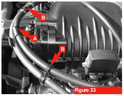9. Remove the throttle cable/evaporative canister hose bracket and bolt from the stock manifold. Install the bracket on to the supercharger as shown (see arrow A, figure 33). Insert the throttle cable and evaporative canister hose, and install the Zip Ties on the throttle cable and evaporative canister hoses as shown (see arrows B, figure 33).