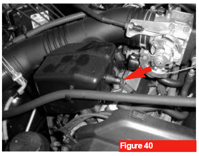 5. Rotate the stock heater hose assembly (see arrow, figure 41) located on the firewall and rotate approximately 30 degrees upward. This will provide proper clearance away from re"routed valve cover breather hose.