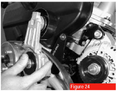 7. Place the dynamic tensioner on to the mounting plate with the belt behind the pulley (figure 24). NOTE: Align the stud on backside of tensioner to small hole "C" in belt tensioner plate (figure 22).