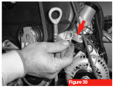 7. To assist in belt installation, using a 3/8" long handle ratchet (figure 29), pull down in direction of arrow to provide slack on belt.