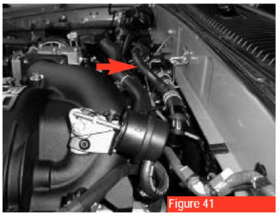 5. Rotate the stock heater hose assembly (see arrow, figure 41) located on the firewall and rotate approximately 30 degrees upward. This will provide proper clearance away from re"routed valve cover breather hose.