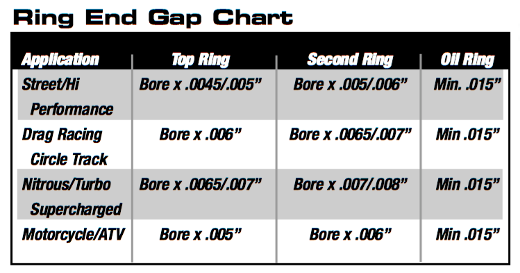 To determine the ring end gap look for your application in the proceeding table. ALL BORES MUST BE CONVERTED TO INCHES. Example: Bore size is 81mm - to find top ring end gap for a street application.