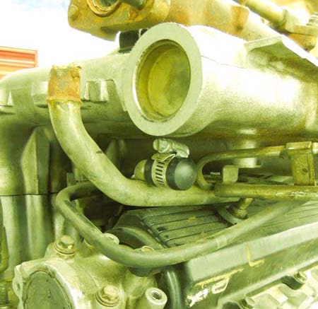 16. We also are removing the air injection pair valve. Follow the large hose off the pair valve and remove the hose under intake manifold . Install the 5/8 vacuum cap use the stock clamp. (Picture 1 & 2).