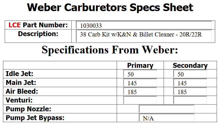 - Weber 38 Carb Kit w/K&N & Billet Cleaner - 20R/22R, see Part #: 1030033