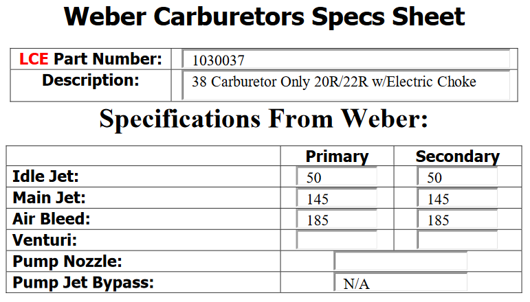 - Weber 38 Carburetor Kit With Manual Choke 20R/22R, see Part #: 1030034