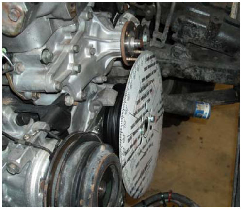 1. The first step is to Install the degree wheel on the crankshaft, then make a pointer for the degree wheel using a stiff piece of wire, such as a metal coat hanger. Loop the opposite end of the wire onto one of the engine bolts (usually you can use a timing cover or water pump bolt).