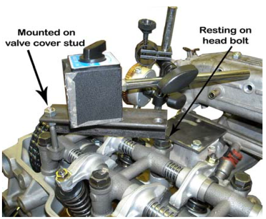 With the valve cover off you will use a valve cover stud to mount the magnetic base plate. Install one of the supplied nuts onto the valve cover stud. Install the plate over that stud and adjust the nut so the plate will rest flat on the nut with the opposite corner resting on top of the head bolt (or stud). Install the other supplied nut on top of the plate and snug it down to hold the plate from moving. See pic below.