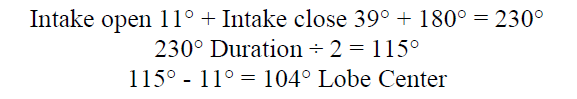 - Calculate Lobe Center: To figure the exact lobe center add intake open number and intake close number plus 180º. Divide this total by 2 and subtract the smaller number (usually the intake open number). In our example (below) your cam is currently set to a 104° Lobe Center. Compare your actual findings with the information from your cam card and adjust the cam accordingly.