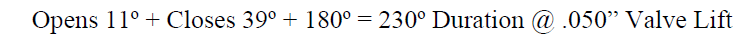 Calculating Duration. To calculate duration at .050 valve lift . Add the degrees when the valve opens @ .050" to the degrees the valve closes @ .050" plus 180°. Example below.