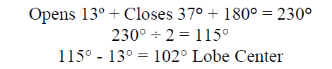 - Calculate Lobe Center: To figure the exact lobe center add intake open number and intake close number plus 180º. Divide this total by 2 and subtract the smaller number (usually the intake open number). In our example (below) your cam is currently set to a 104° Lobe Center. Compare your actual findings with the information from your cam card and adjust the cam accordingly.
