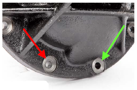 2. If you are using a Trail-Gear housing, you will need to use the included 25mm and 30mm bolts in the bottom two holes of the housing. These bolts should be inserted from the outside, into the housing. The 30mm bolt goes into the hole located within the raised surface (green) while the 25mm bolt is inserted into the remaining hole (red).