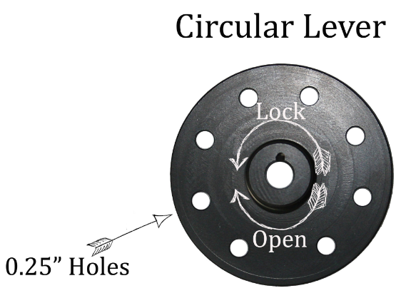There is a lot of adjustment built into the Circular Lever. The eight, .25" Holes move in increments of +/- 2.5° in relation to the Spur Gear Teeth. There are 18 teeth on the Spur Gear, making each tooth 20° apart.