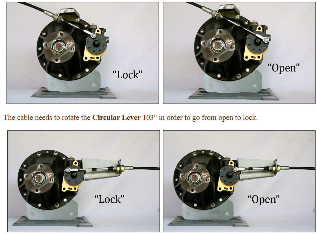 Install the Bulkhead thru the Differential Cable Bracket. Rotate the Circular Lever counter clockwise to "full lock". You will feel/hear the detent when the locker fully engages. Now cycle the Hand Shifter into the "lock" Gate.